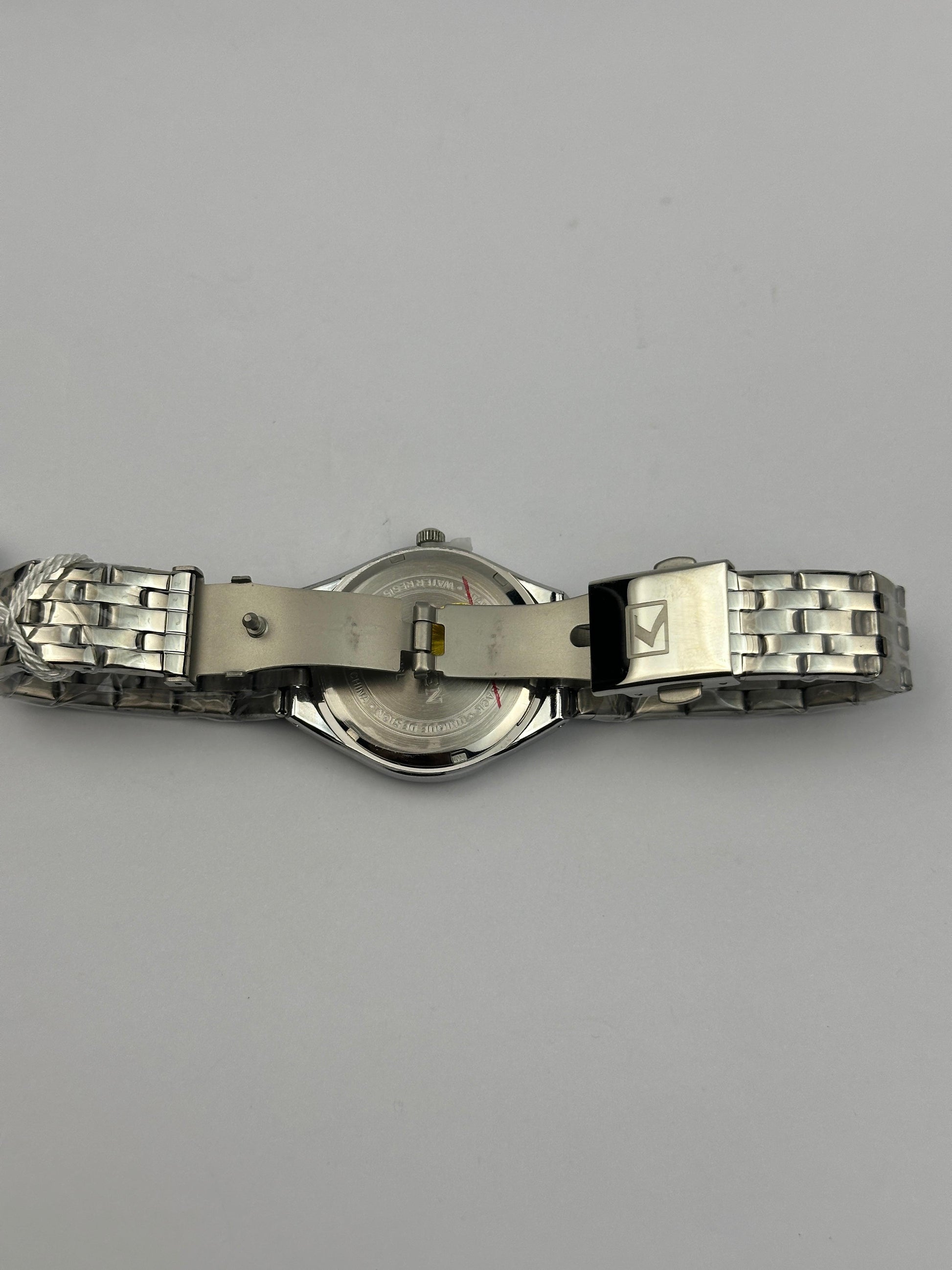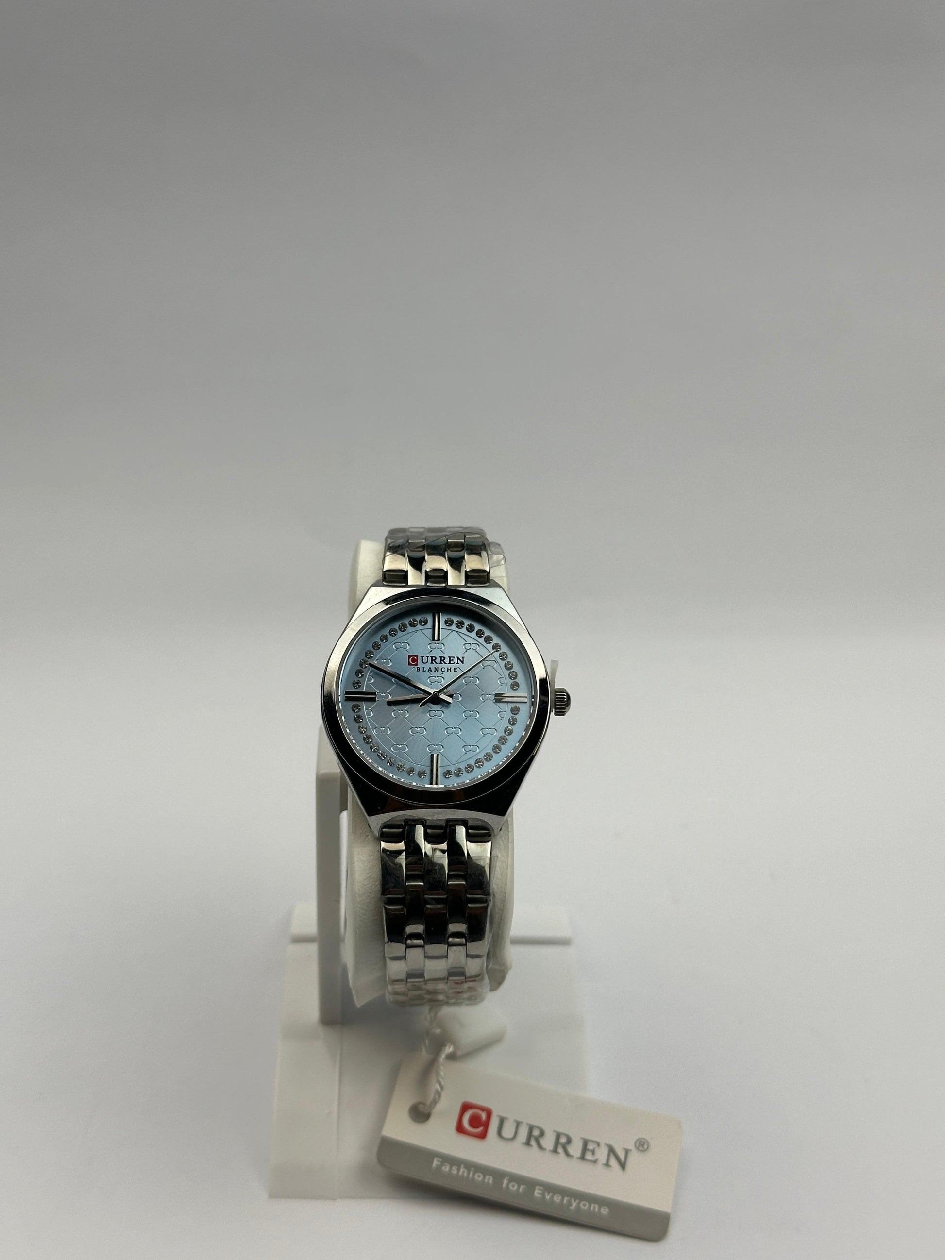 This beautiful wristwatch features a vibrant light blue dial with a circle of diamond-like accents at the center. The sparkling stones on the bezel add an extra touch of glamour, catching the light with every movement. The polished silver-tone stainless steel case and matching jubilee-style bracelet complete its refined look. It offers a premium feel without the premium price, making it a perfect example of budget luxury.