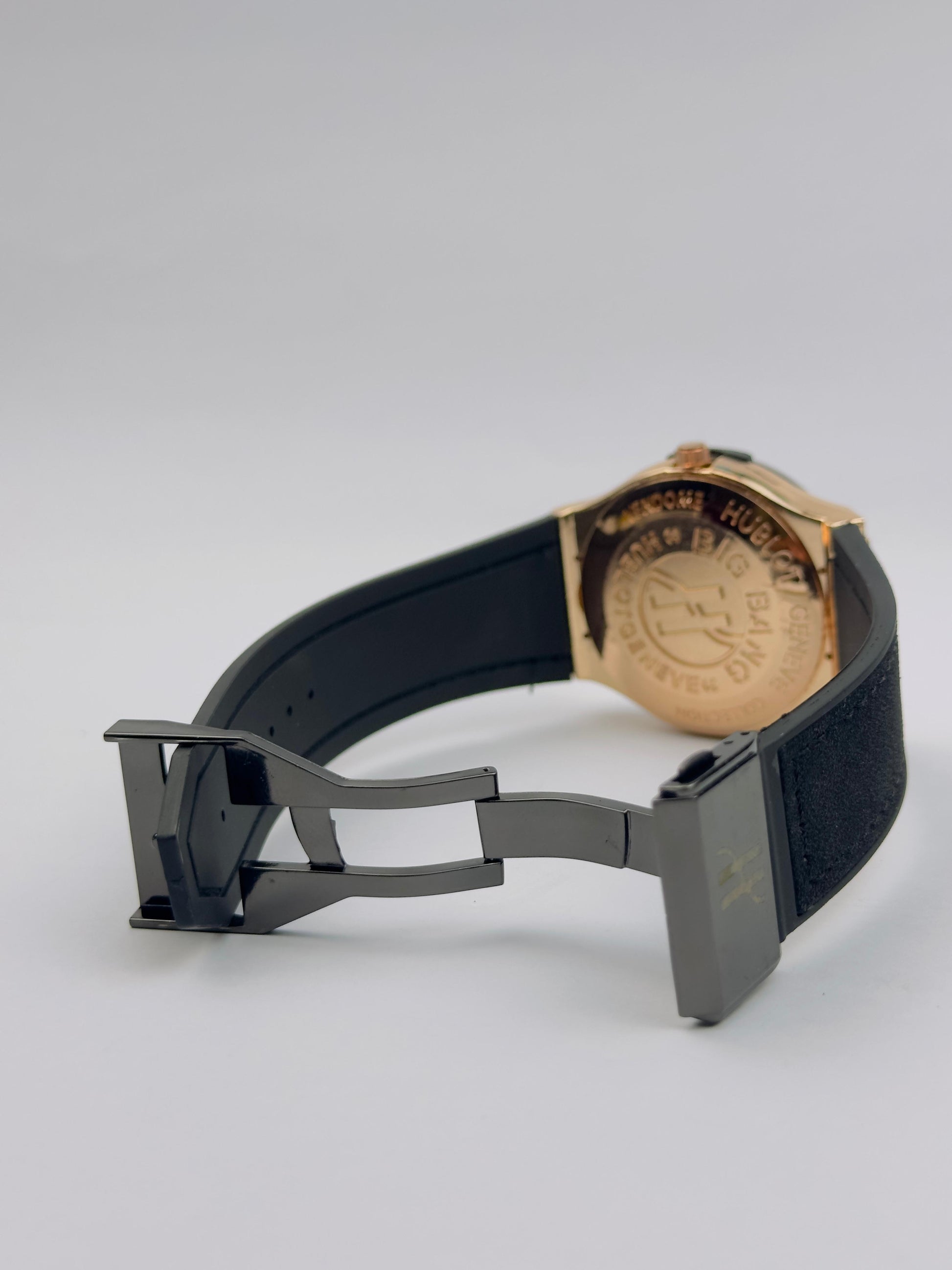 Introducing this stunning Men's Hublot Chronograph Watch from Tick Empire, your go-to for branded watches. This timepiece is designed to be the centerpiece of your watch collection. It features a striking rose gold case and a bold black dial with chronograph subdials, creating a truly sophisticated and sporty look. This watch is a testament to affordable watches that offer a high-end feel, giving you prestige styling without the high price.