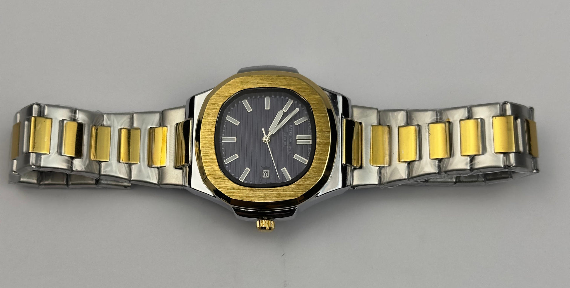 Case Material: Polished stainless steel with gold-tone bezel (Nautilus-inspired shape)
