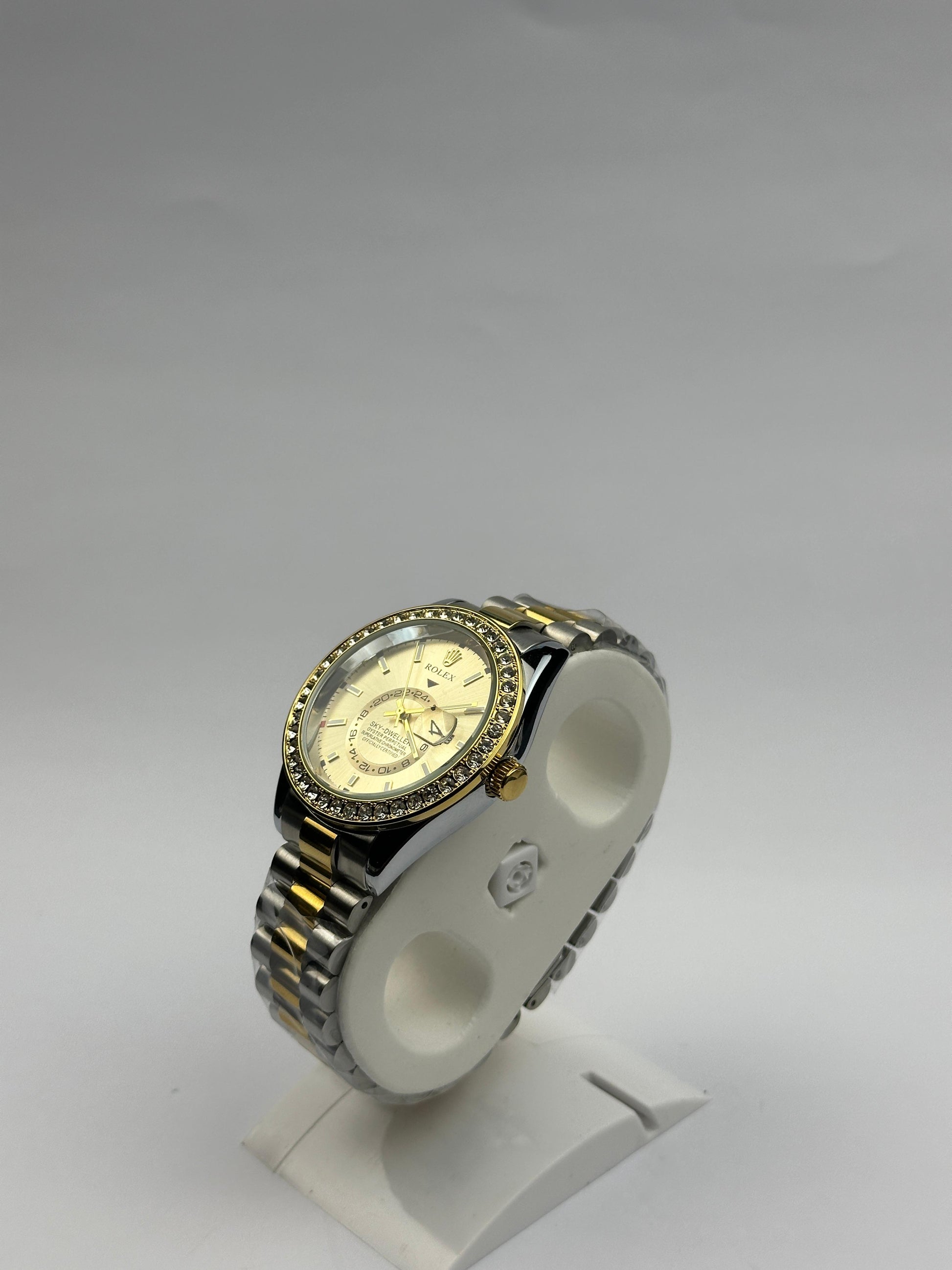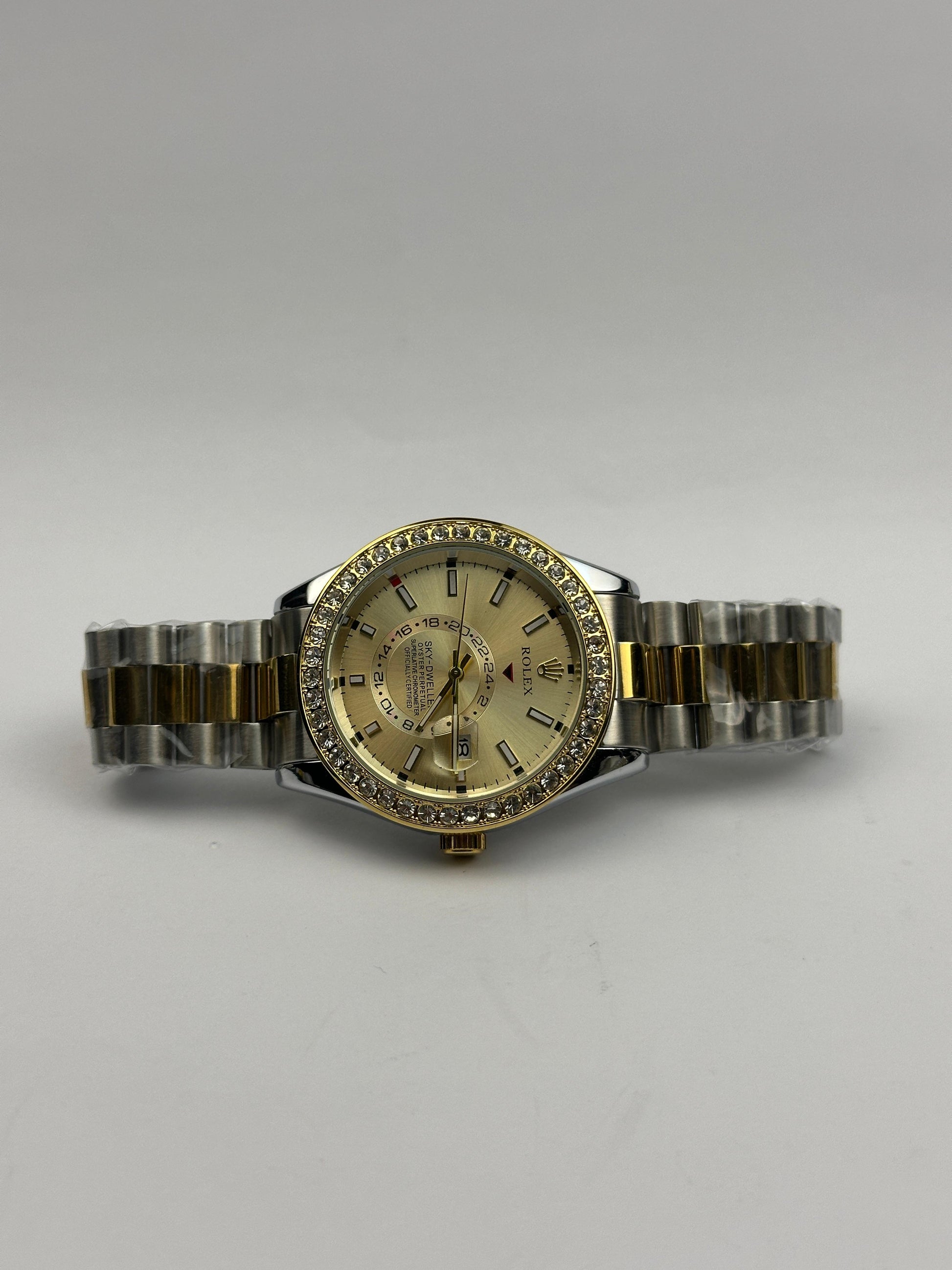 Prestige-Inspired Design – Diamond-studded bezel and two-tone bracelet for a luxury look.