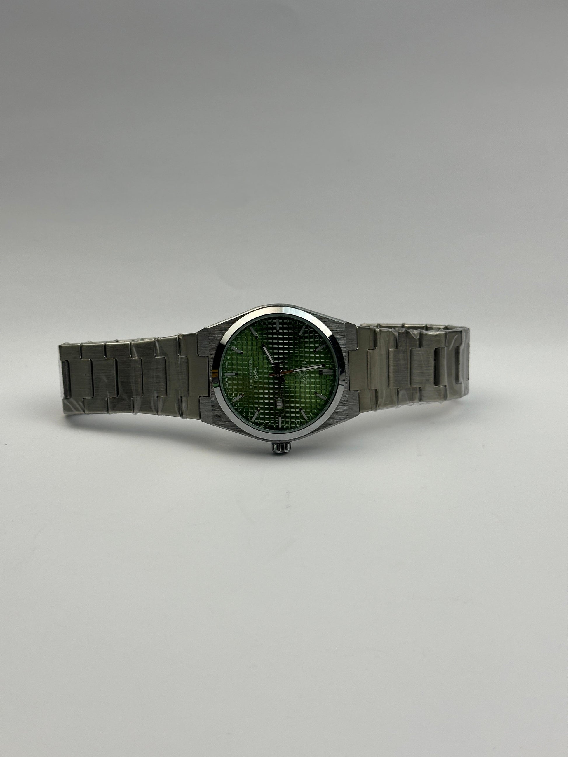 This striking wristwatch features a deep green dial with a sophisticated, waffle-like textured pattern, luminous baton markers, and a date window at the 3 o'clock position. The elegant stainless steel case and integrated bracelet create a seamless look that is both modern and timeless. It's the perfect accessory to elevate your daily style, whether you're in the boardroom or out for the evening.