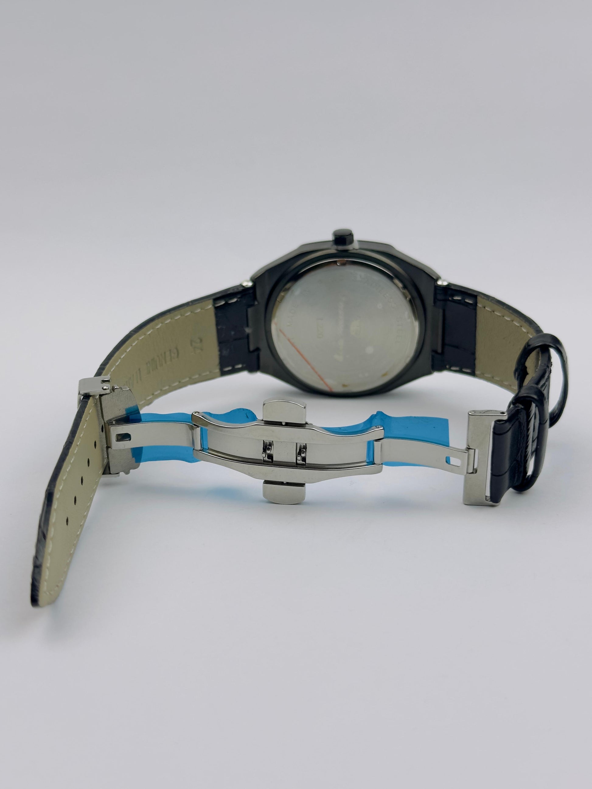 Powered by a reliable quartz movement, the watch includes both a day and date display to keep you perfectly on schedule. The comfortable black leather strap with a crocodile texture ensures a secure and polished fit, making it perfect for both professional and casual wear. Whether you're dressing for a formal event or just elevating your daily style, this timepiece offers a sense of luxury without the high cost.